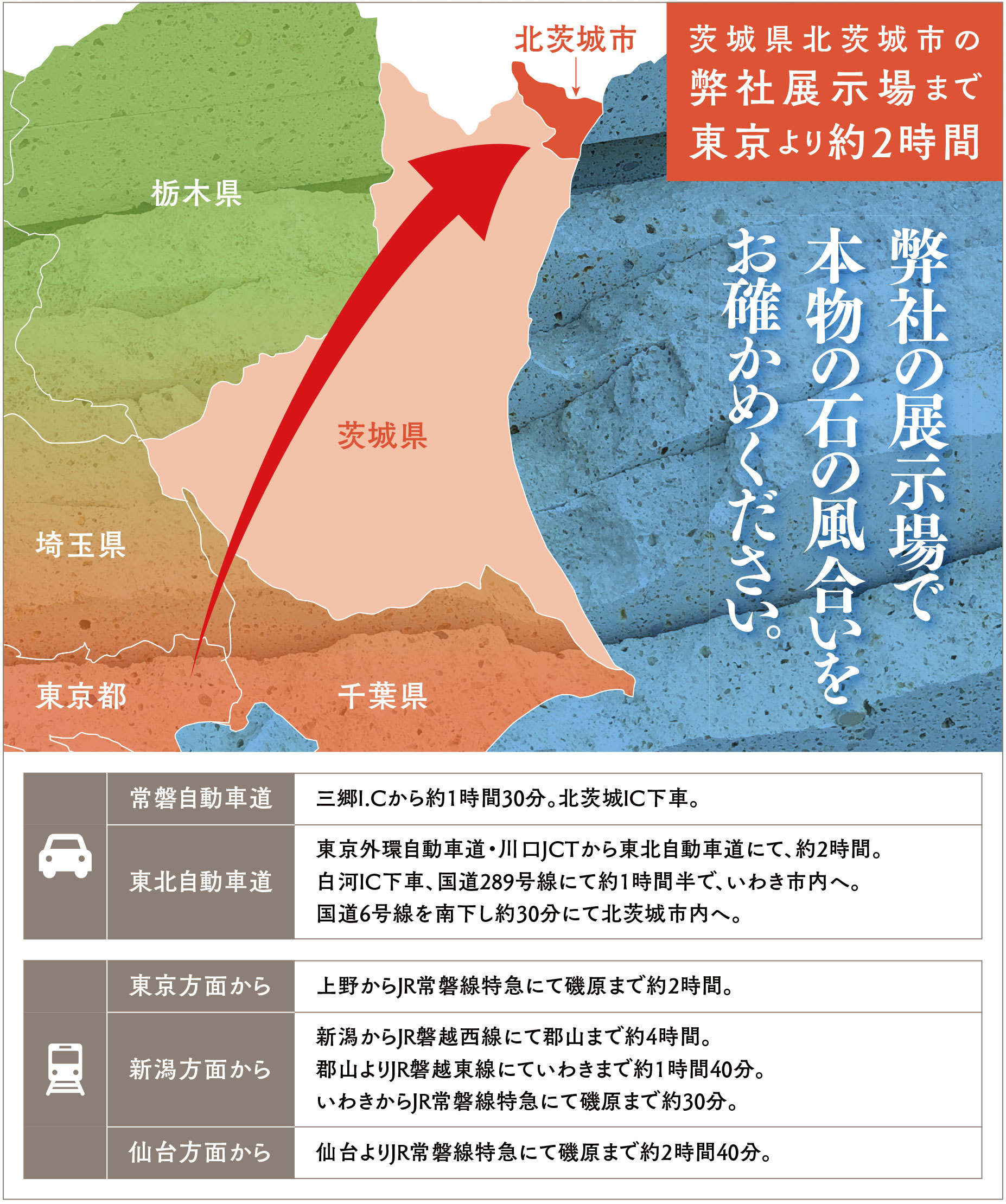 弊社(茨城県北茨城市磯原町内野294)までは、東京より約2時間。弊社に隣接する展示場にて、北関東以北〜東北地方の様々な国産石製品と施工展示を行なっております。石の力を活かす技術でお客様の想いに応えるプランをご提案いたします。
