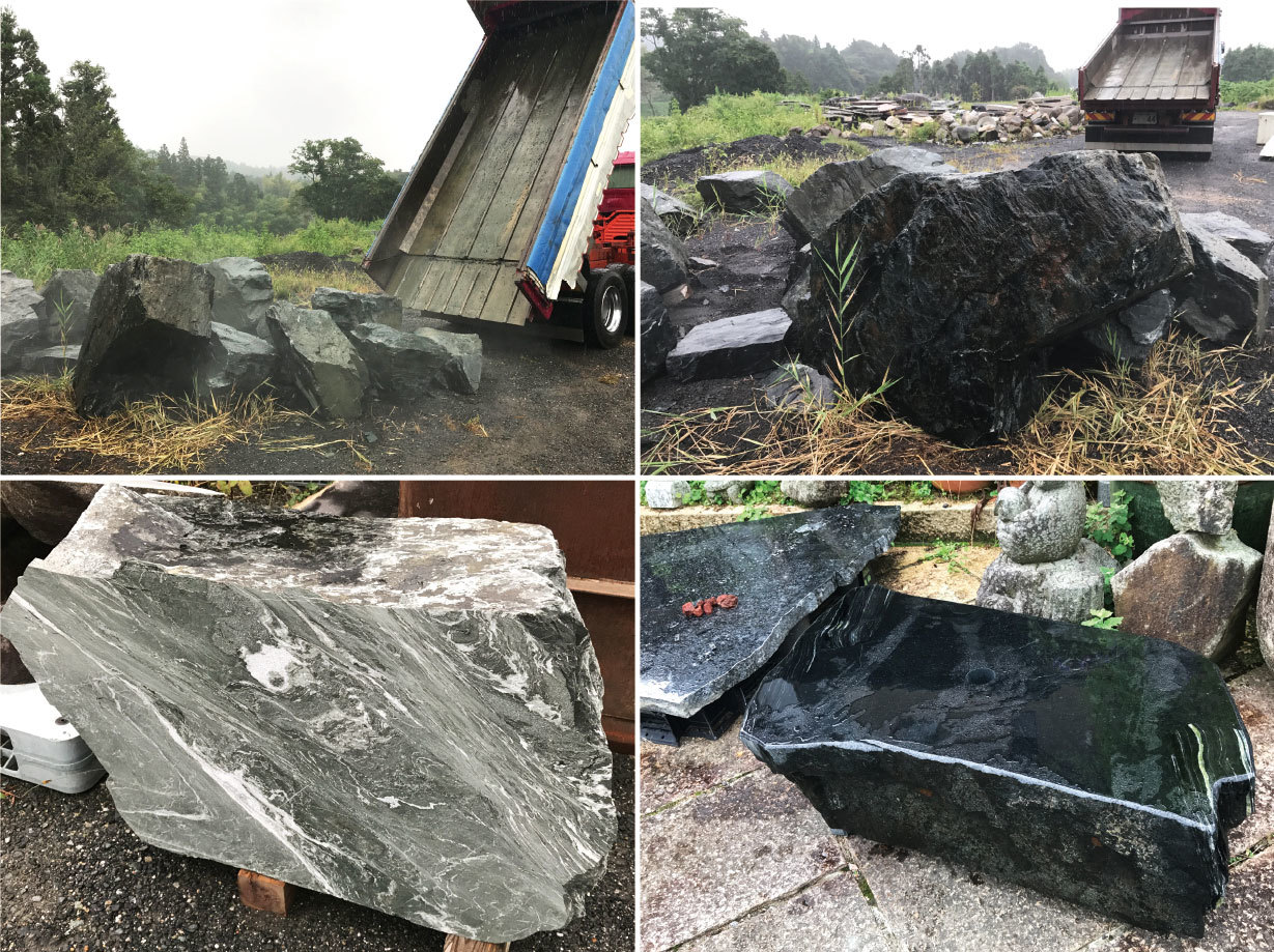 北茨城市から採掘される常陸角閃岩は、艶と煌めき、そして漆黒や濃いエメラルド色が魅力です。ガーデンパラソルの台座に、モニュメントに。庭のイス、室内の石張り、デザイン表札、記念プレートにも。使い方は無限大です。自然石のお洒落な生活をお楽しみください。