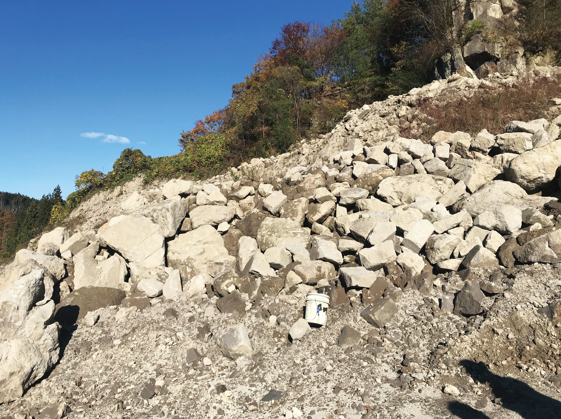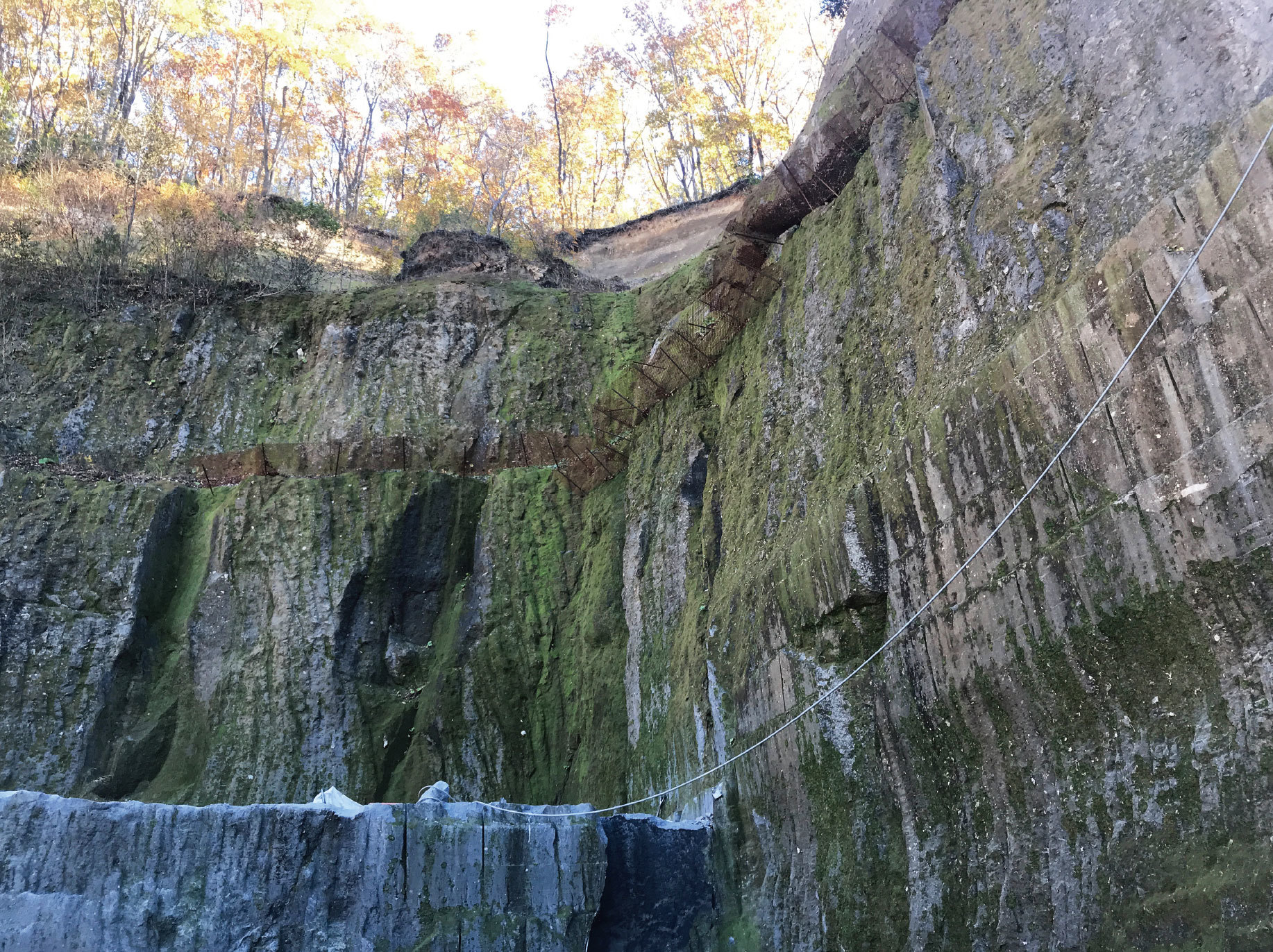 火薬による発破の他、ワイヤーソーで石を外しています。石のキズを読み、どのように石を外すのかを職人が判断いたします。
